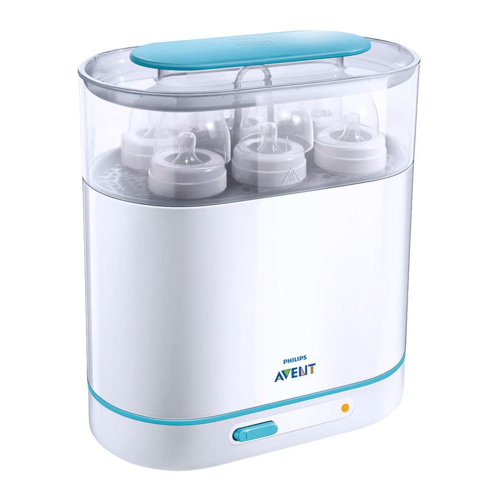 Keep your baby’s feeding bottles and cups hygienic with this premium-grade sterilizer from Avent. The 3-in-1 sterilizer utilizes high-temperature steam to effectively kill 99.9% germs. It comes with plenty of space and can hold up to 6 Avent feeding bottles in a single go. The sterilizing cycles lasts about 6 minutes after which the sterilizer automatically shuts off. This ensures that the bottles are not overheated or over-treated. The sterilizer has a unique 3-in-1 flexible design which lets you fit bottles into it in a flexible way. It is also compact in shape and easy to store.