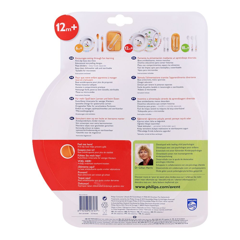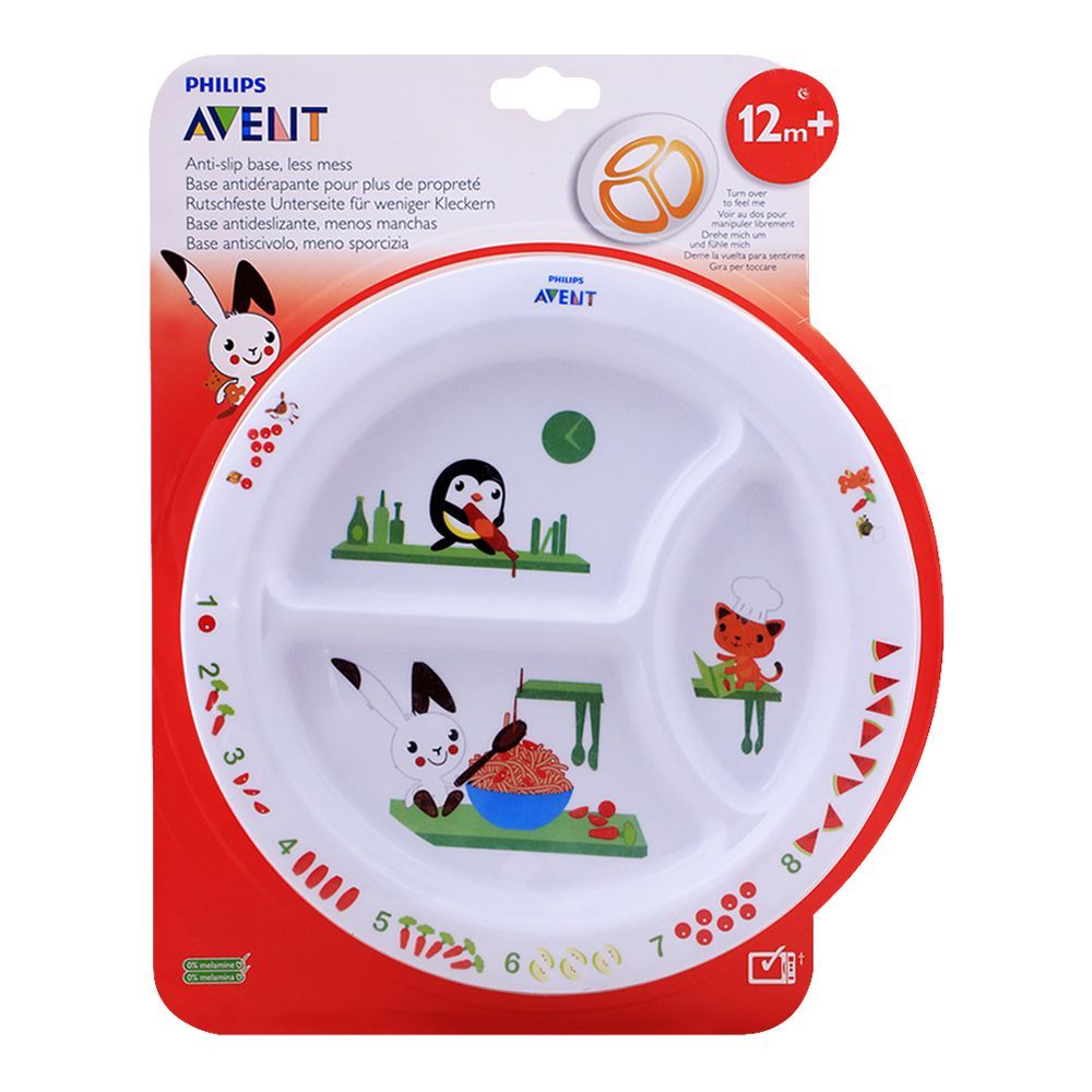 Make your kid's first meal fun filled and educational at the same time with Avent Toddler Divider Plate, 12m+, SCF702/00. It is designed with colorful drawings to encourage your baby enjoy snacking while listening interesting stories. The divider helps keep food separate on one plate and not mix up. Its anti-slip base prevents fall-offs, spills and mess. It is easy to clean, dishwasher safe and suitable for microwave. It is developed on the idea of a child psychologist, Dr. Gillian Harris. Provide a happy, learning food time with Philips Avent divider plate.