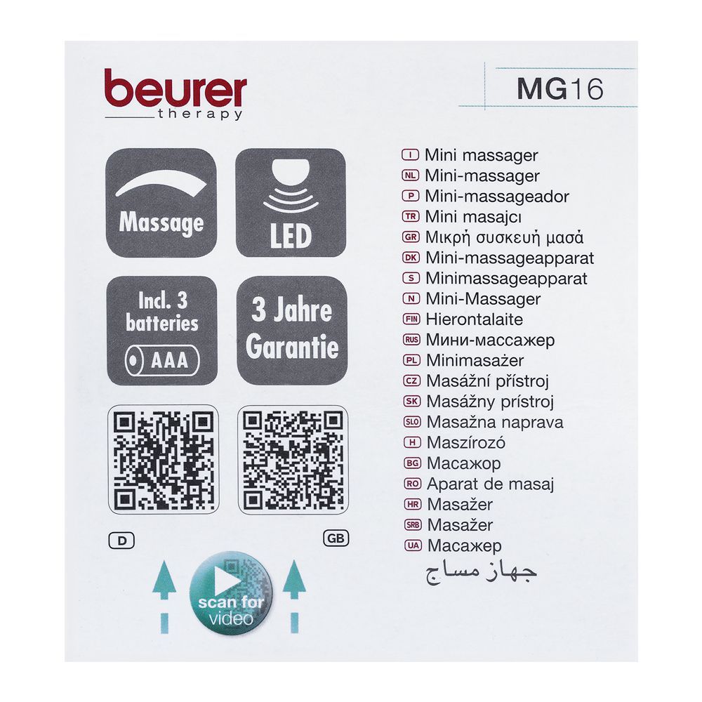 Relax your stiff muscles and get relief from pain with Beurer Handheld Mini Body Massager, Battery Operated, MG 16. Keep your handheld massager with you and treat yourself with a soothing therapy before you get back to your daily life routines. Its compact shape and these beautiful LED lights give it a unique design. It relieves sore and tensed muscles with gentle vibrations. Battery operated Beurer mini massager comes in a small easy-to-handle size. Massage at home, carry to your office or put in luggage while traveling.