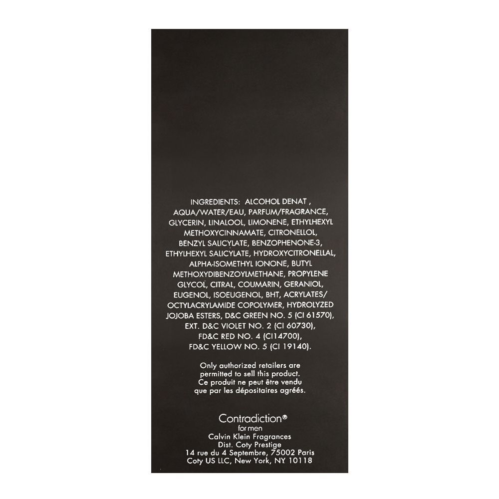Contradiction for Men Edt 100ml is an Eau De Toilette perfume with refreshing and sensuous floral notes. Launched in 1998, it was created by Carlos Benaim and Pierre Wargnye. A breathtaking masculine smell, its floral key notes consist of jasmine, lily of the valley, peony and rose. The middle notes have eucalyptus, syringa, orchid and pear blossom, which add more to its freshness. Base notes have tonka bean and sandal. Sleek and stylish glass bottle is covered inside a slate grey packaging.
