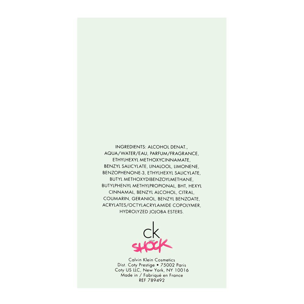 Sensual, feminine and understated, the Ck One Shock For Her Edt 100ml features a blend of fruit and sweet notes that emulate a simultaneously warm and cozy appeal. It’s excellent blend of oriental and floral notes epitomize a zesty, bright and refreshing aura that revitalizes you throughout the day. The beautiful composition of top, middle and base notes feature blackberry, dark chocolate, vanilla and amber along with patchouli and musk. Its soft, creamy scent is definitely one of kind.