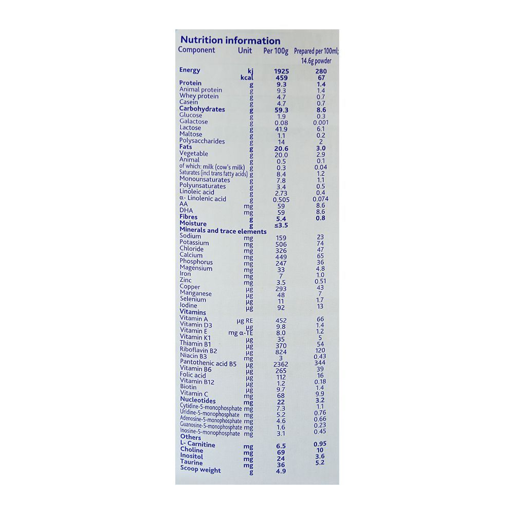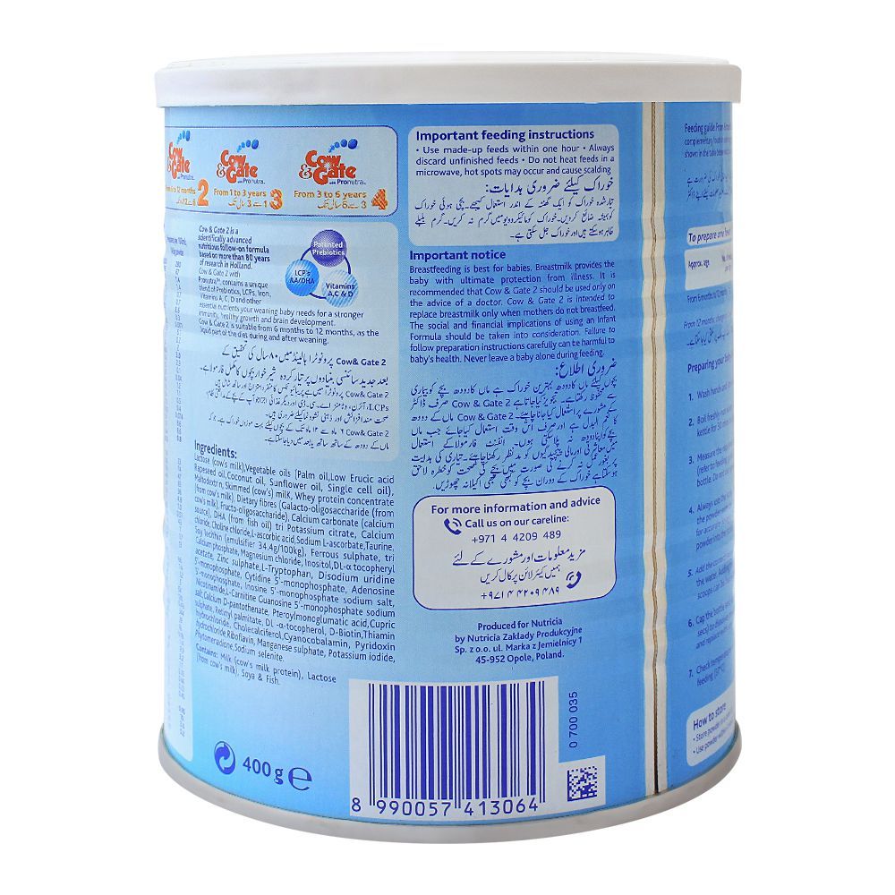 Take good care of your little one’s health with Cow & Gate With Pronutra No. 2, Follow-On Formula. It is a nutritious blend of iron, vitamin A, C, D, and calcium that helps build up stronger bones, develop better immune system, and allows healthier growth. It is specially formulated for better brain development of your baby with its iron rich ingredients. This milk is an easy to use powdered milk, which is an ideal alternate for babies who cannot be breastfed. It gives protection to them from illness in a substitute milk form. Cow & Gate Follow-on milk makes sure that it provides key nutrients to babies of 6 – 12 months.