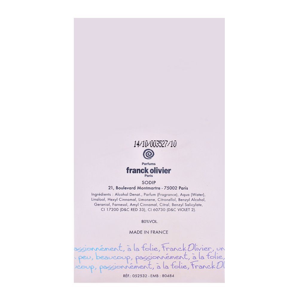 Fresh, flowery and scintillating, the Franck Olivier Passion Pour Elle is yet another masterpiece by the maestros working with Franck Olivier to provide some of the best perfumes known to man. If there is one Eau de Parfum that can be considered to have a romantic scent, it has to be the Franck Olivier Passion Pour Elle. It brings together the perfect combination of exotic flowers and fruity smells from the tropics. The top notes of the Franck Olivier Pour Elle consist of mandarin orange, blood orange, papaya, peach and black currant to really set the fruity tone of the fragrance. This is followed by the floral scents of the heliotrope, violet, roses, Tiare flowers, jasmine with the baseline consisting of sandalwood, abrette and apple tree in the heart tone of the perfume. The compact 75ml bottle is made in the shape of a delicate flacon with a heart shaped motif embellishing the bottle.