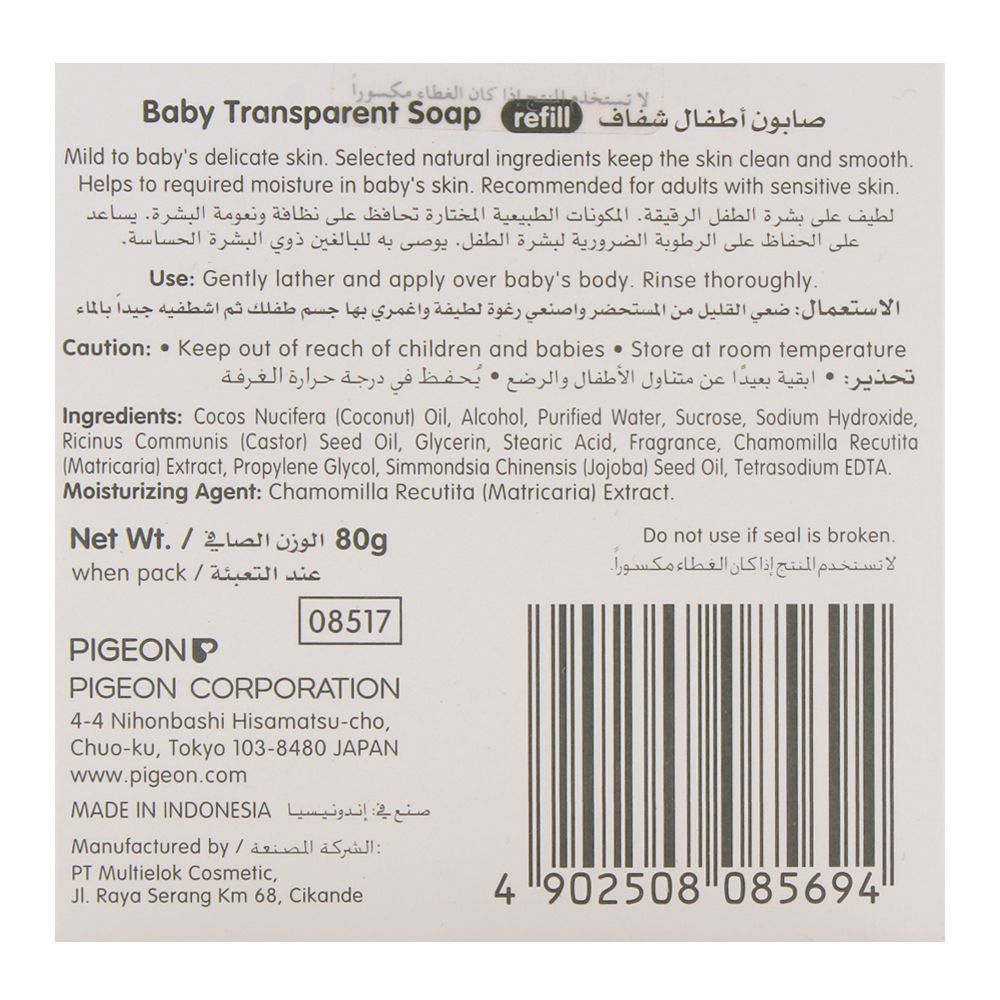 Make your baby skin soft and supple by washing it with this gentle Pigeon Baby Transparent Soap Refill 80gm. Babies have delICate skin and they require a soap made with their skin in mind. This soap is made from natural ingredients, thus making it the perfect soap to use to give your baby a bath.