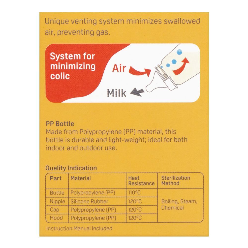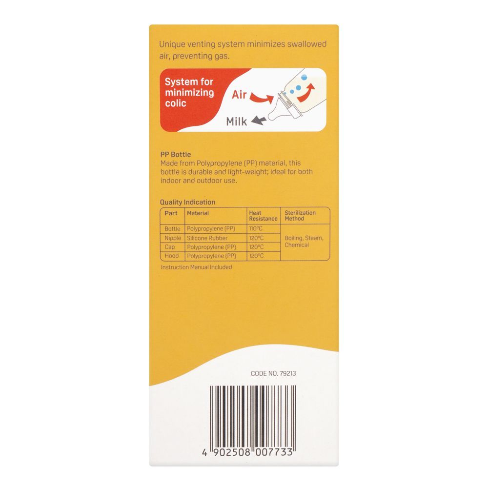 The Pigeon Peristaltic Nipple Nursing Bottle A-773-483 allows your baby to enjoy the comfort of breastfeeding even when you are apart. It features a peristaltic nipple that is super soft and flexible to allow natural tongue movement and easy sucking. The BPA-free, polypropylene material makes it durable and lightweight, and hence travel-friendly. It has an anti-colic air ventilation system to reduce the intake of air and gas and make feeding time fuss-free and comfortable. It is the all-time favorite feeding bottle of mothers, as it is easy to hold, clean, and carry around.