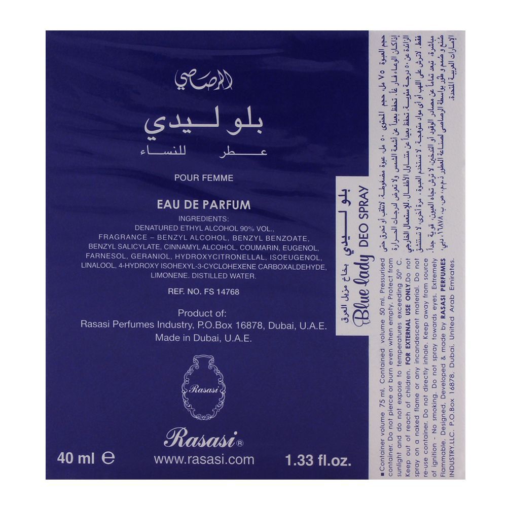 One of the most fantastic perfumes by Rasasi, Rasasi Blue Lady Perfume 40ml is a package filled with the heart-touching aromas of flowers and woods. A long-lasting fragrance, it stays with you for whole day long. For top notes, it combines Violet Leaf, Ylang-Ylang, African Orange Flower and tuberose. For heart notes, it has plum, peach, jasmine and narcissus. The feminine scent dries down on woodsy notes like vanilla, vetiver, sandalwood, amber and musk. Femininely-stylish blue flask is skillfully paired with transparent hat-like cap.