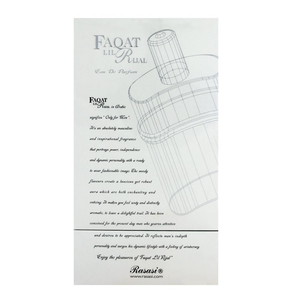 An elegant Eau de parfum, Rasasi Faqat Lil Rijal EDP 50ml is an oriental scent targeted for men of style. Packed inside a very decent-looking silver and black packaging, it is a blend of multiple mind-blowing accords. Its top notes are consisted of saffron and bergamot. Middle notes have geranium, rose and cardamom. The masculine scent dries down on the base notes of Indian oud, musk, leather, patchouli and sandalwood.