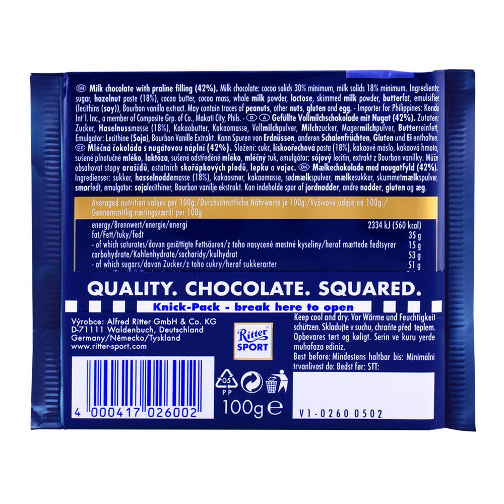 Ritter Sport Nugar Praline 100gm is now available in the market for you to have an amazing eating experience. These chocolate bars are filled up with nougat praline aling with plenty of hazelnuts. It contains 58% of milk chocolate and 42% fine praline packed full of hazelnuts. These hazelnuts are handpicked. They are roasted golden brown and are finely ground. The best thing about these chocolate bars is that it has no fiber content in it.
